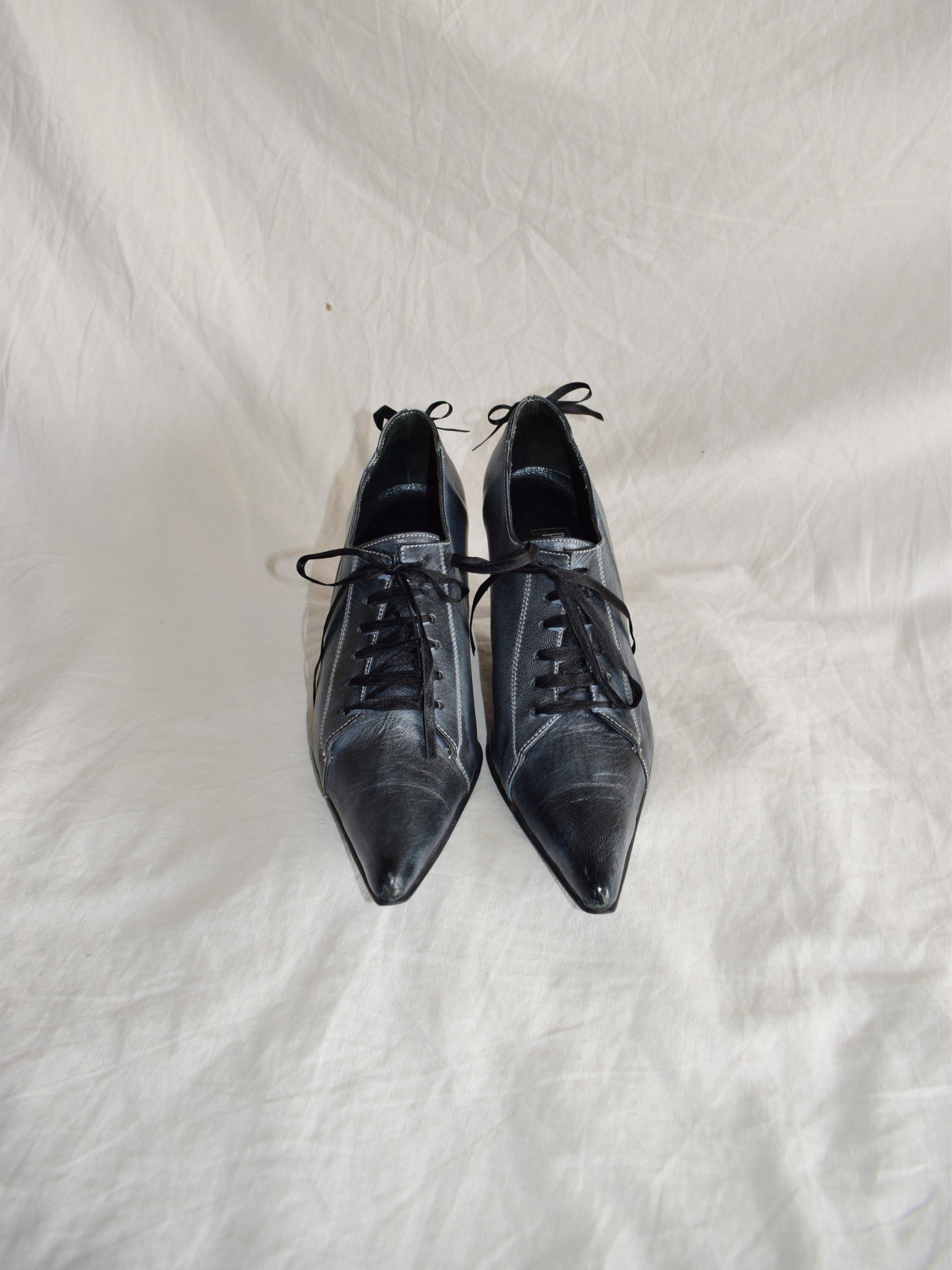 These Roberto Lenzi heels combine gothic elegance with striking design. Featuring a pointed toe, ribbon lace-up front, and bow back detail, they’re finished with a unique sculptural heel. A bold statement piece for any collection.